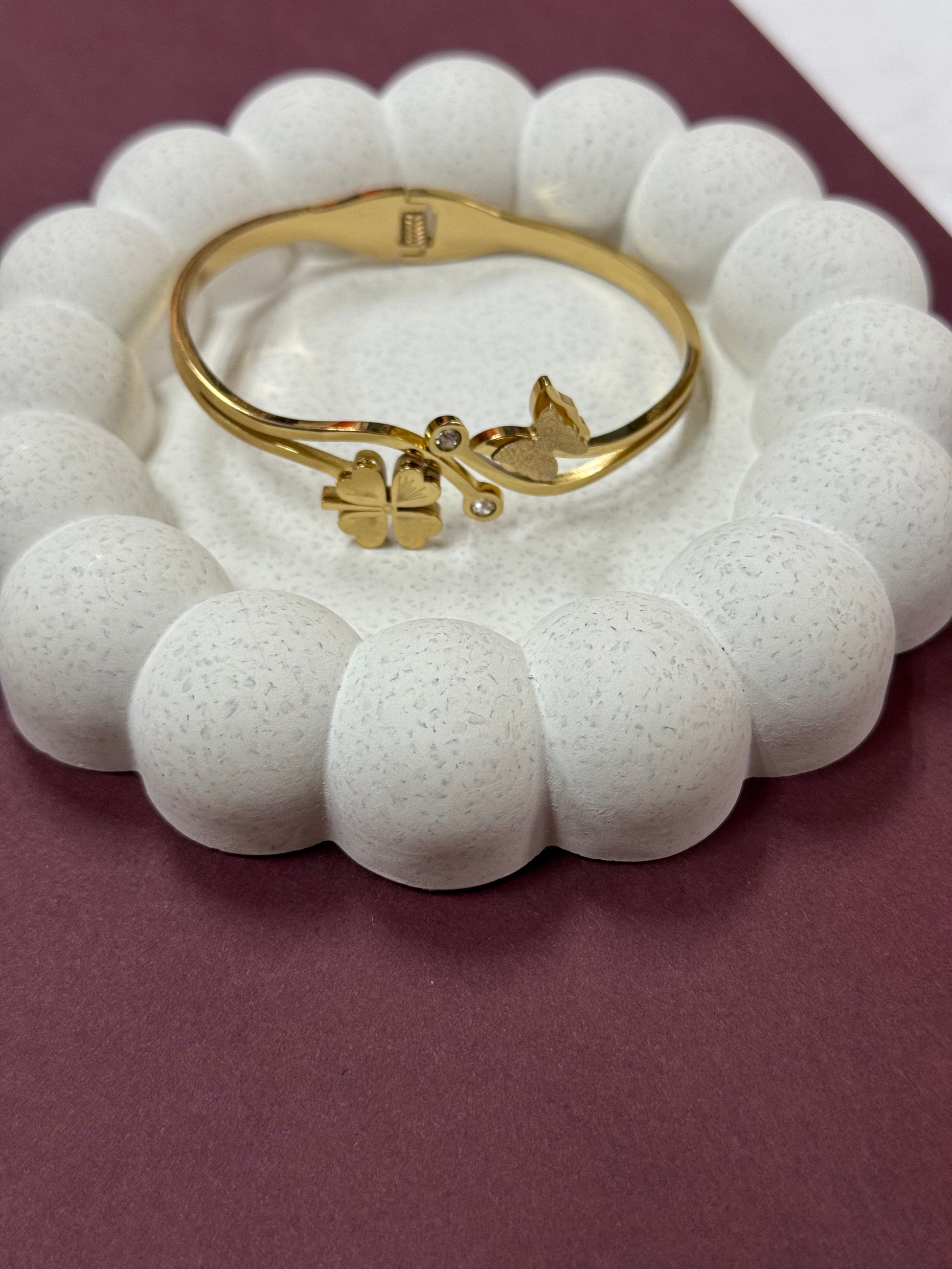 Sleek golden finish ke saath butterfly aur floral charm design, jo is bracelet ko classy aur graceful look deta hai. Daily wear aur special occasions dono ke liye perfect choice.