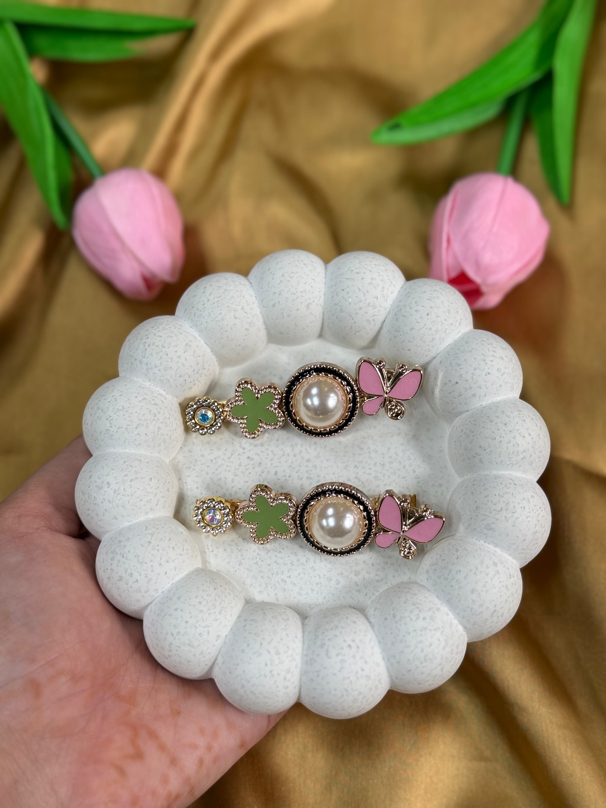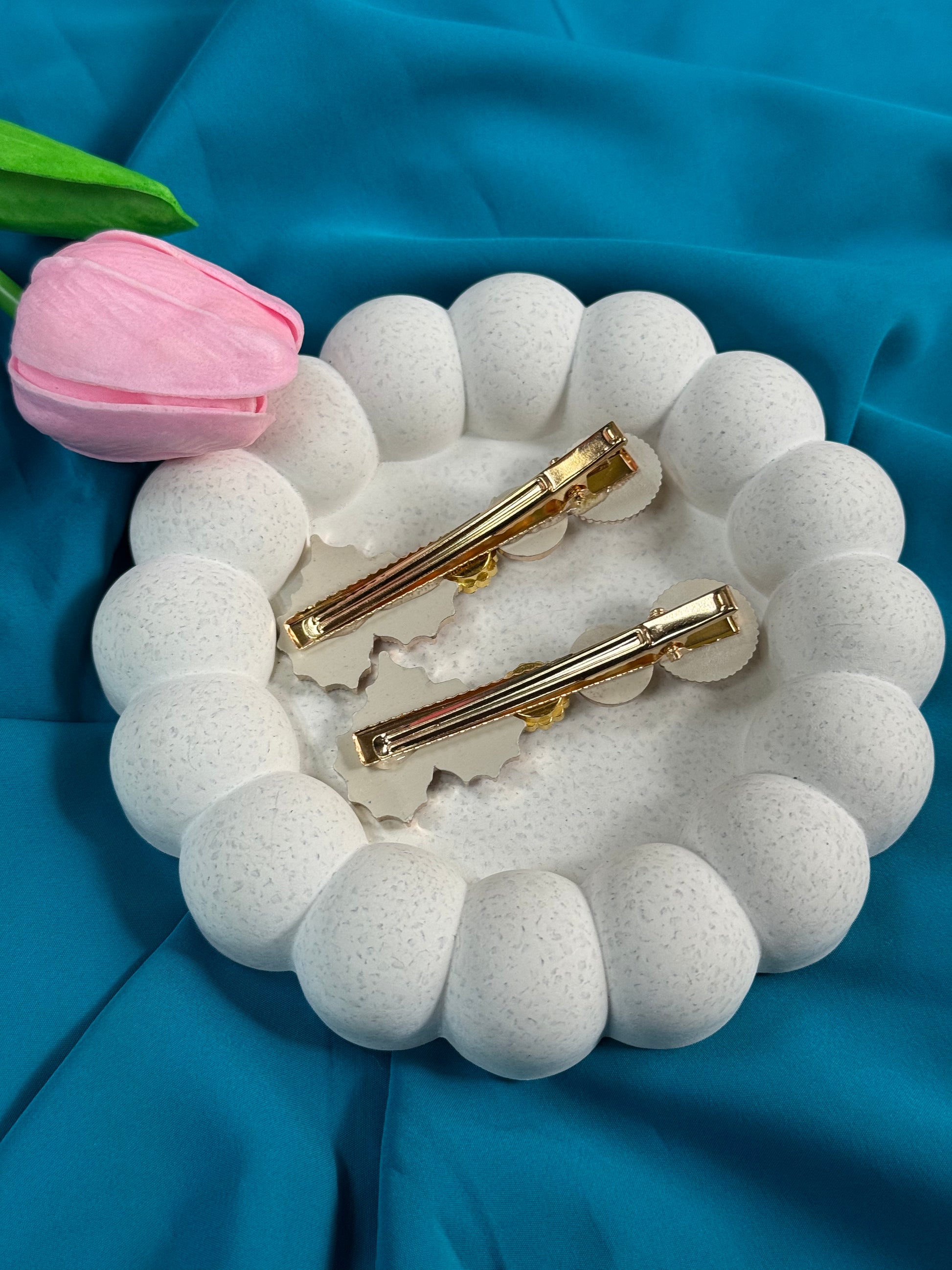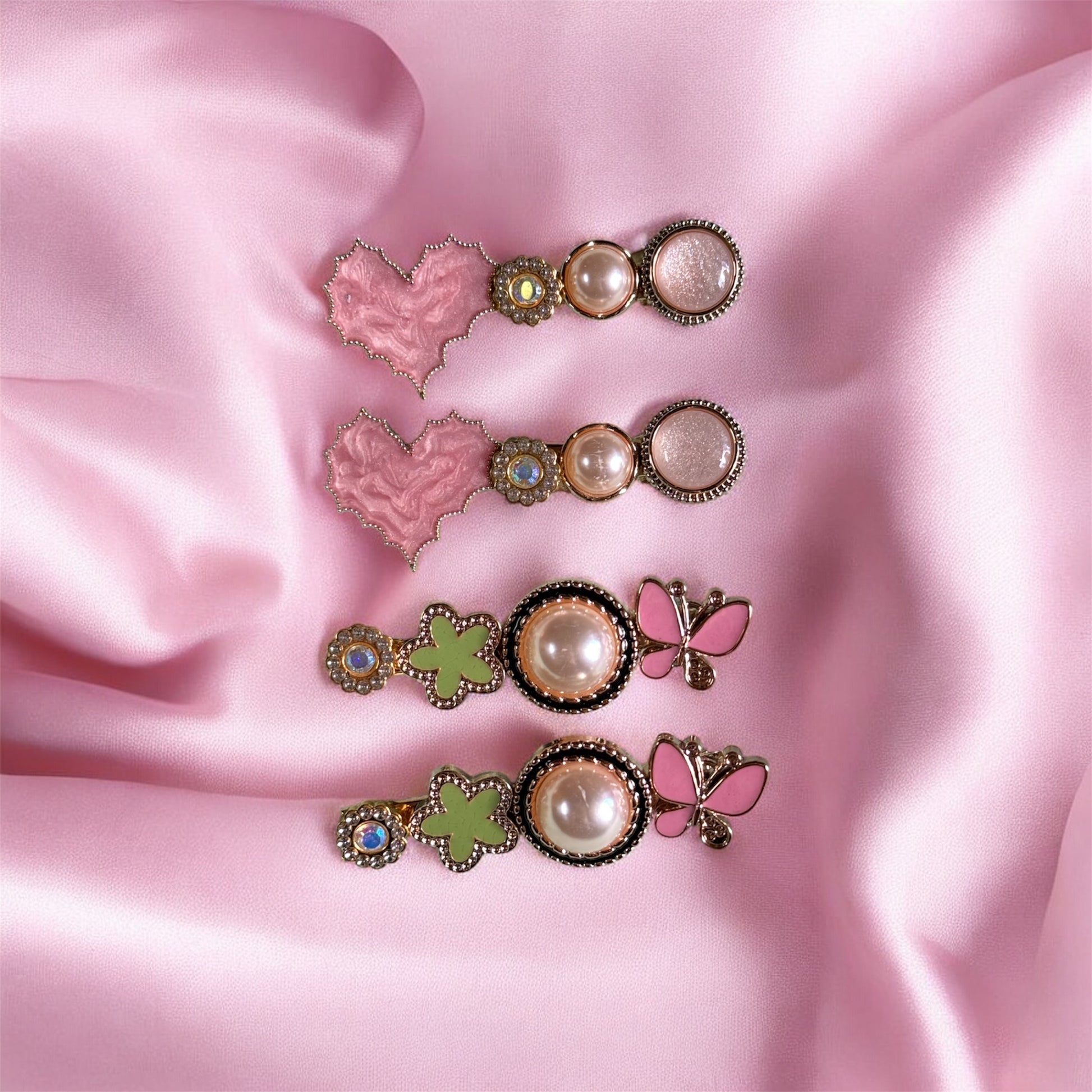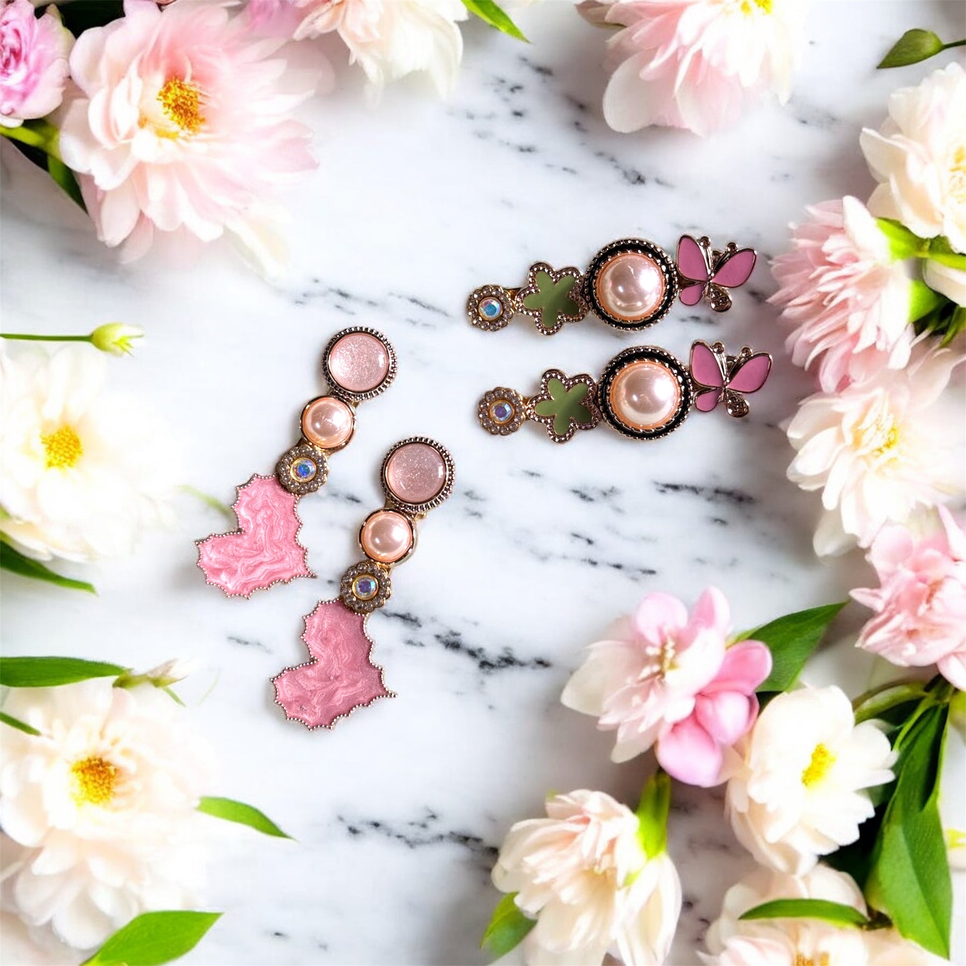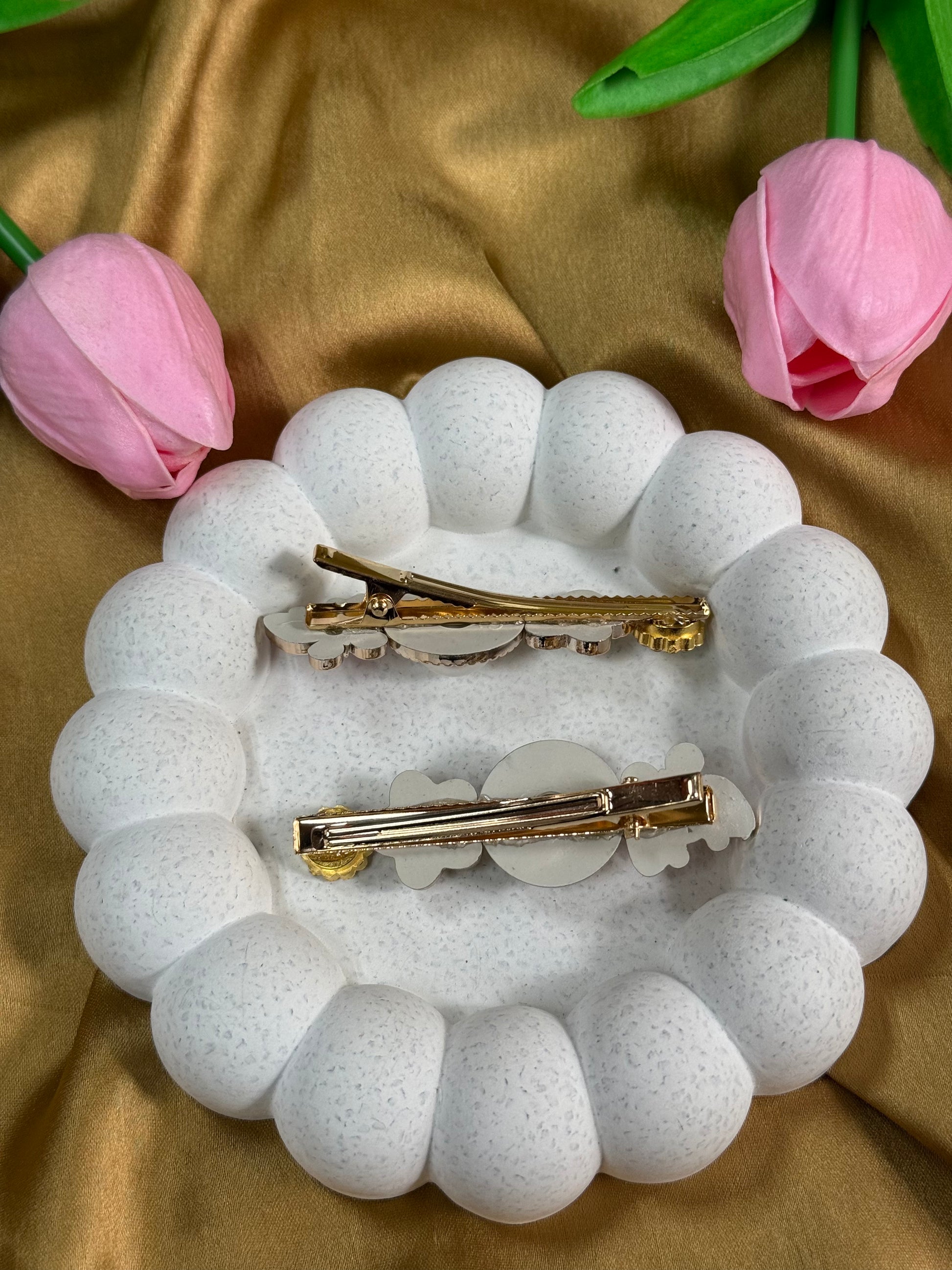 A delicate pink heart-shaped hair clip adorned with pearls and shining stones. It is placed on a white textured tray against a teal/blue background. A stylish accessory perfect for parties and special occasions