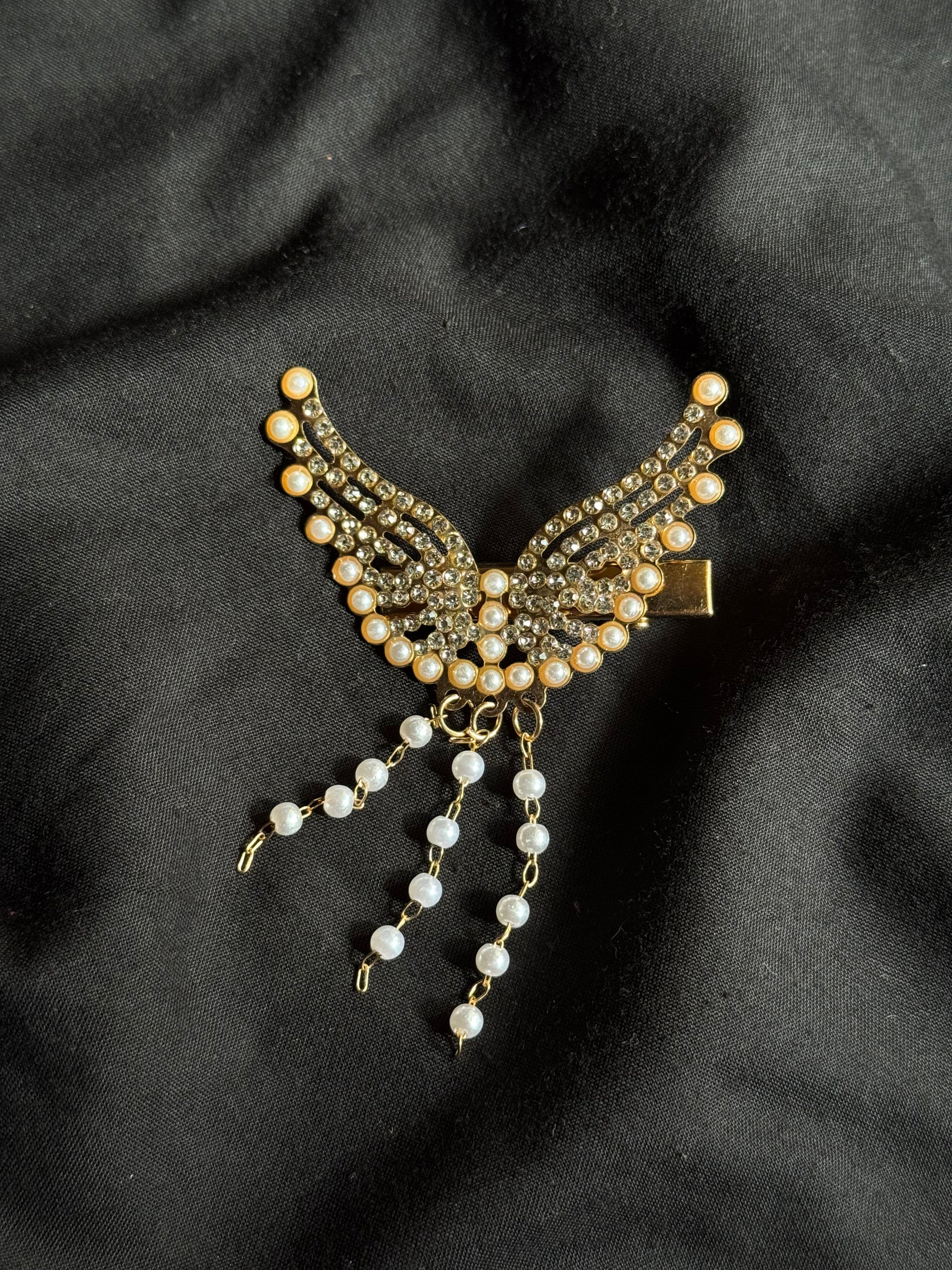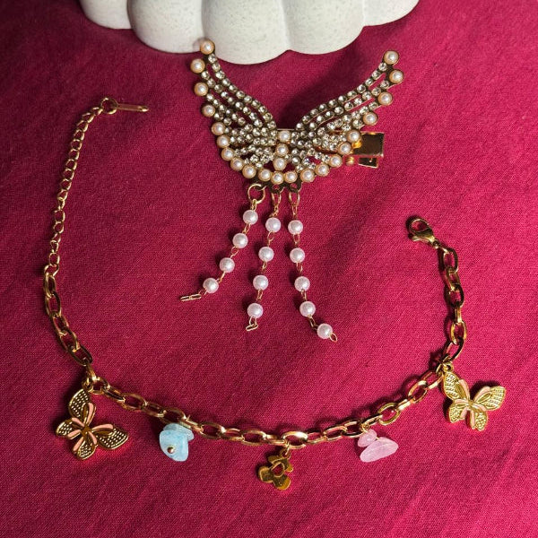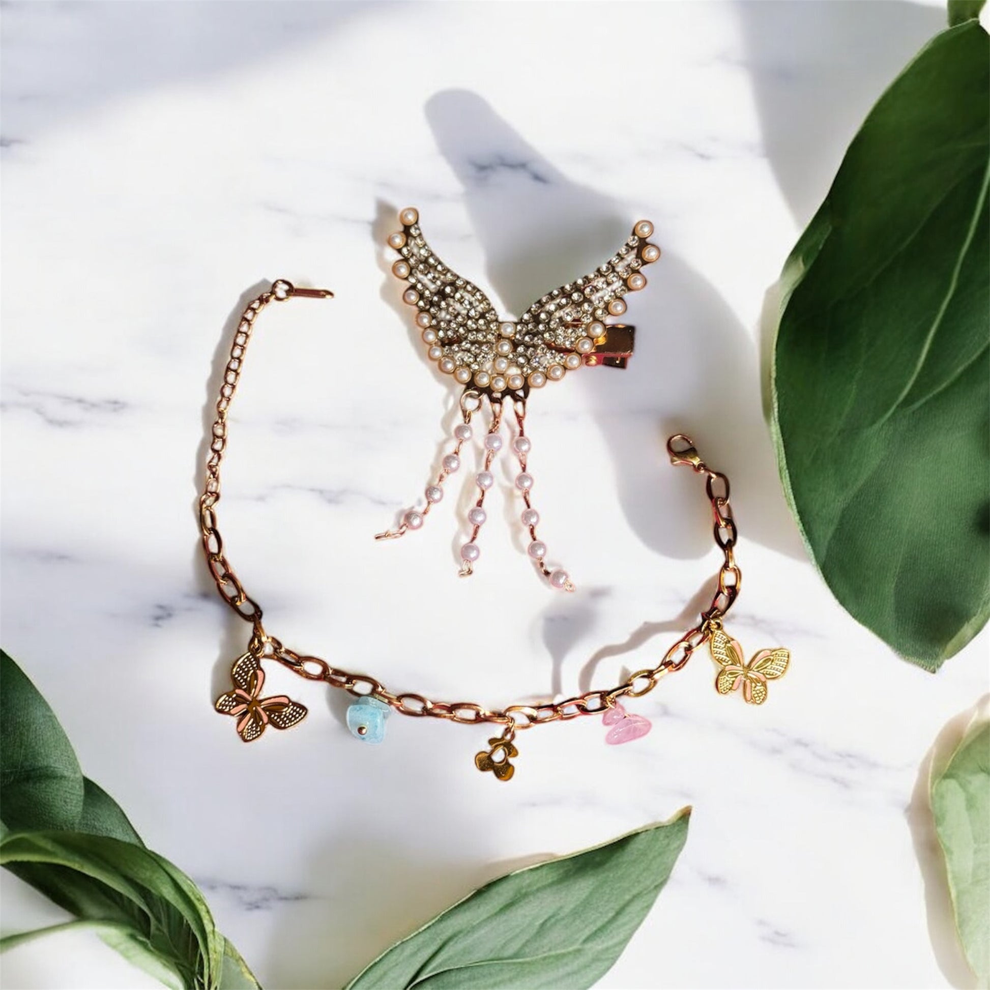 Elevate your festive look with this curated glam combo featuring a stunning wings diamond hairclip and an anti-tarnish chain charms bracelet. The intricately designed hairclip adds sophisticated sparkle to any hairstyle, while the durable bracelet resists oxidation, maintaining its lustrous finish through countless occasions. Perfect for celebrations, weddings, or everyday elegance, this pairing combines timeless design with practical craftsmanship. Each piece complements the other, creating a cohesive accessory collection that transforms your ensemble with minimal effort.