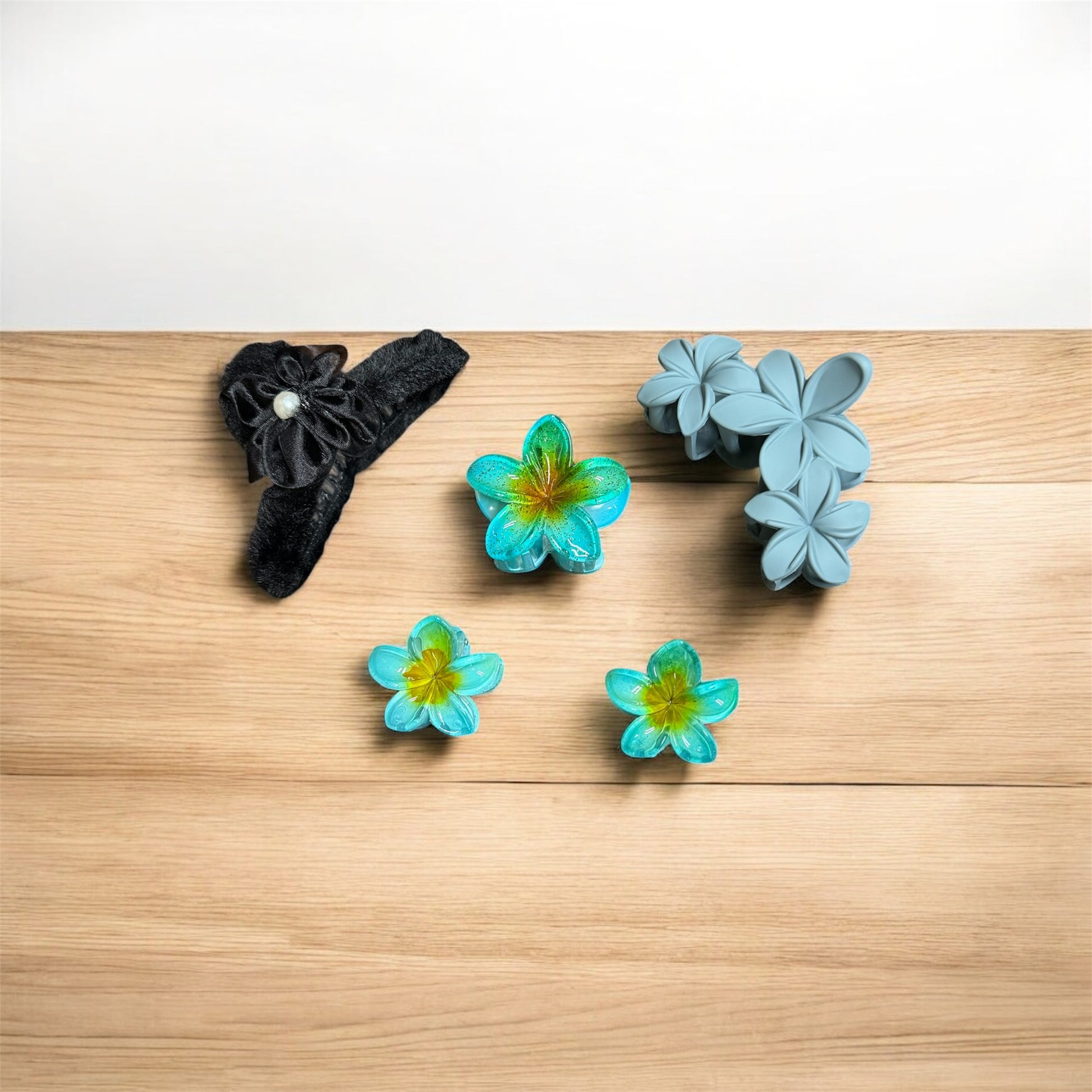 This elegant collection of flower hair claw clips features a mix of modern and classic designs. The set includes glossy resin flower clips in soothing blue and green tones, paired with a soft black fabric floral clip and a matte pastel flower claw. Perfect for everyday styling or special occasions, these lightweight and durable hair accessories add a chic and graceful touch to any hairstyle.