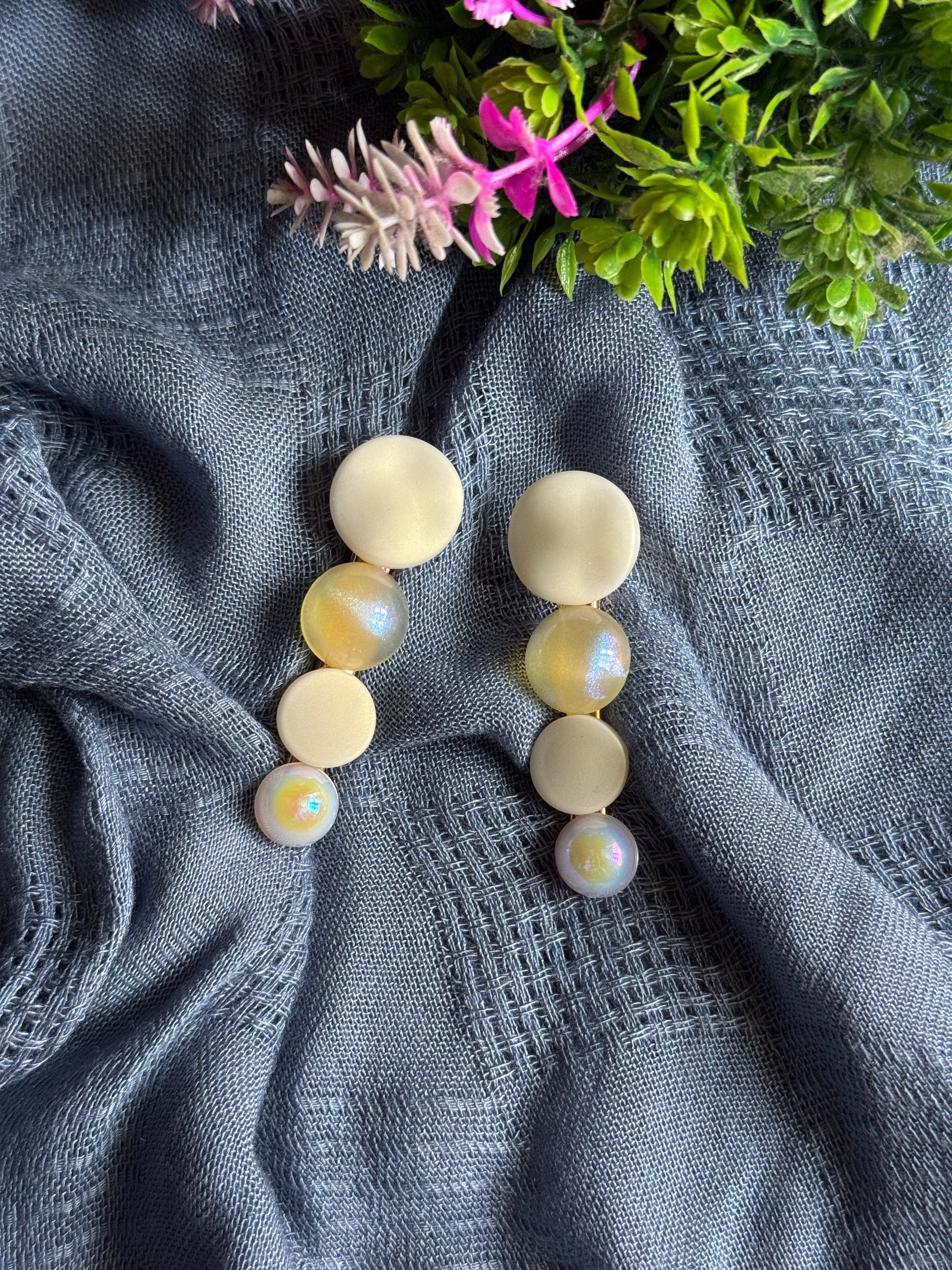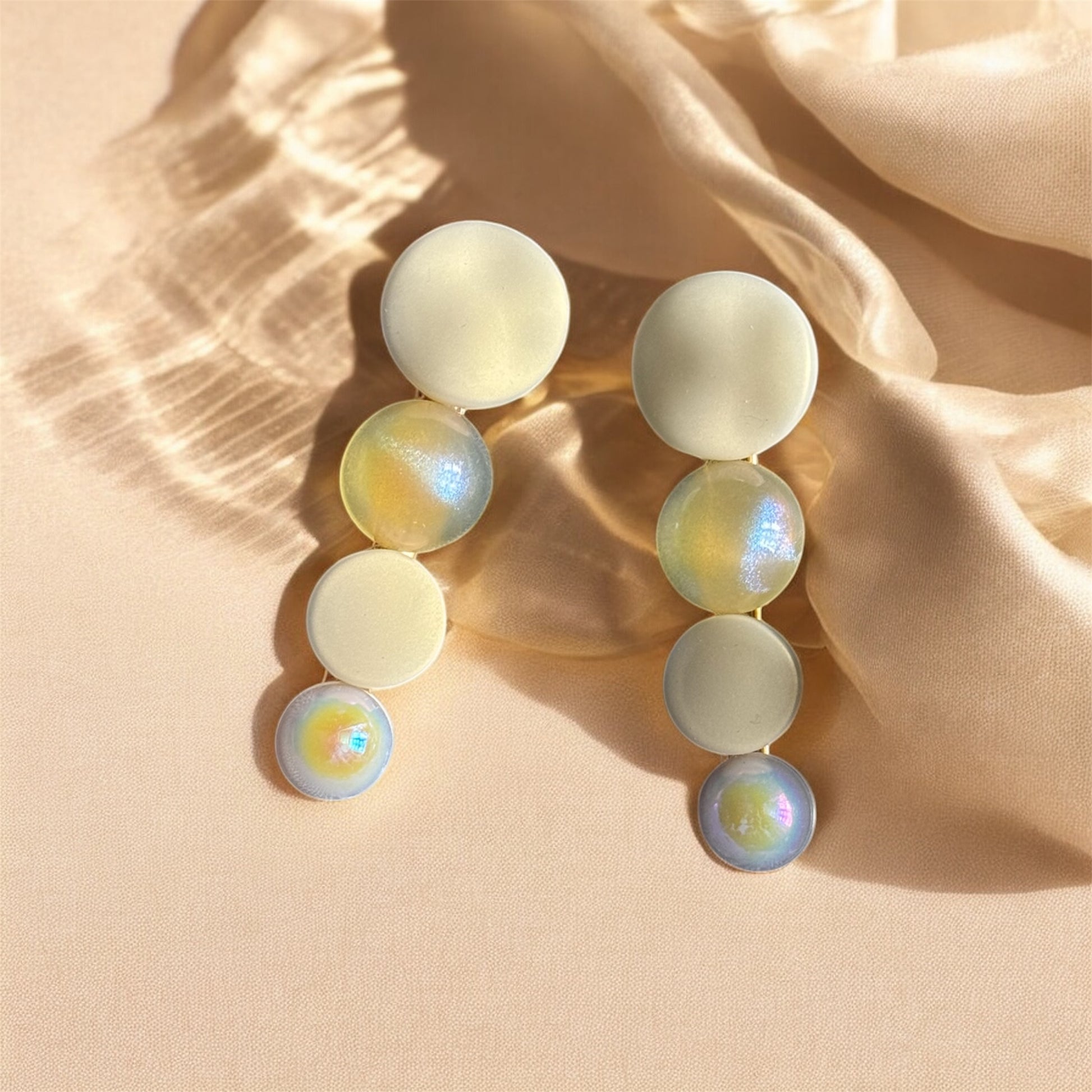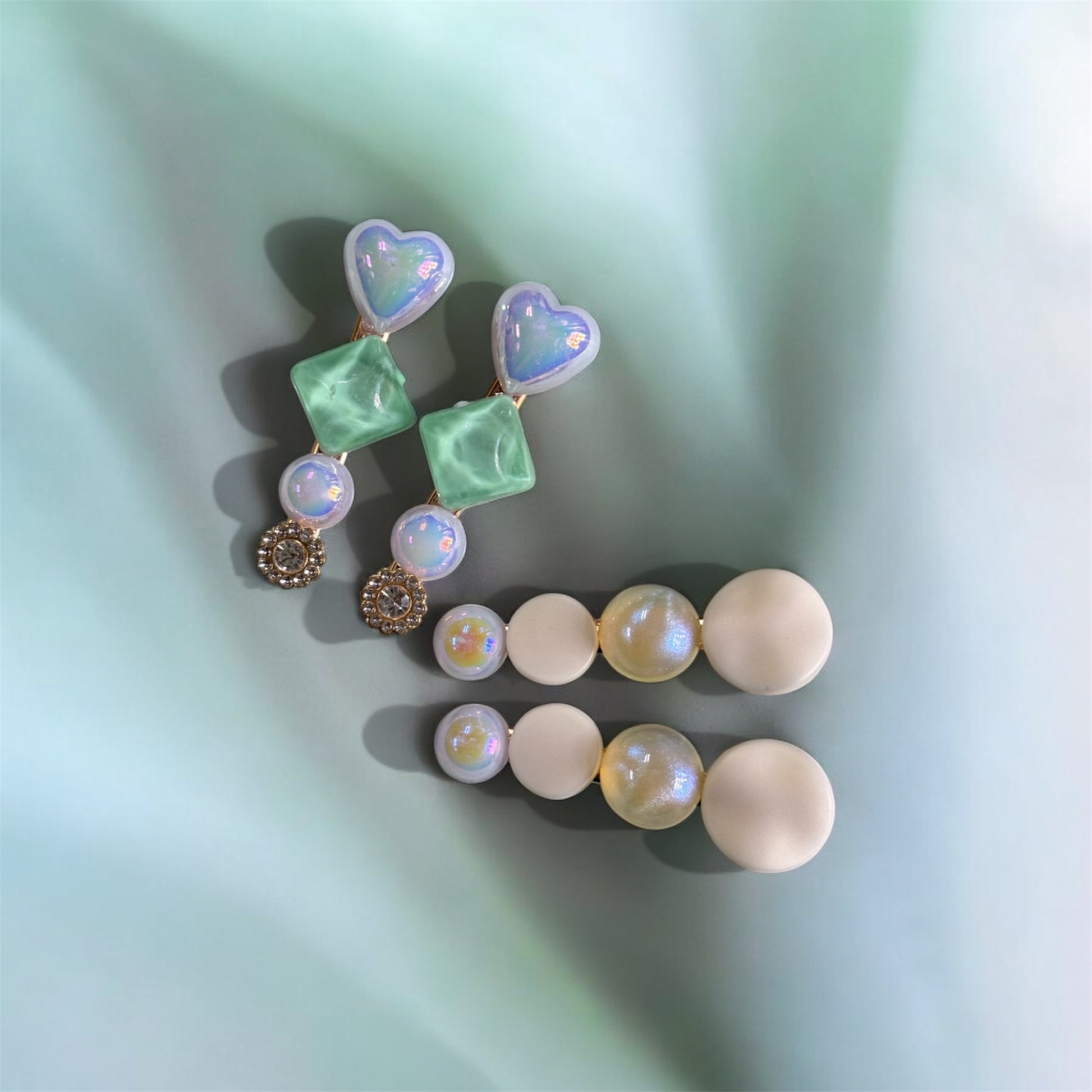 Two pairs of trendy hair clips with a fresh, pastel aesthetic. The longer barrettes feature a mix of shapes—hearts and squares—in shimmering white and mint green resin, accented with small, sparkling rhinestones. The shorter clips consist of a row of smooth, pearl-toned and opalescent round beads, creating a cohesive, stylish set perfect for a soft, feminine look.