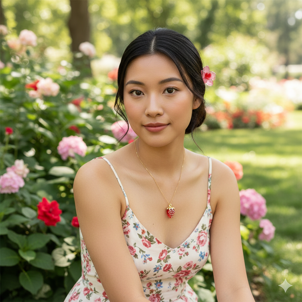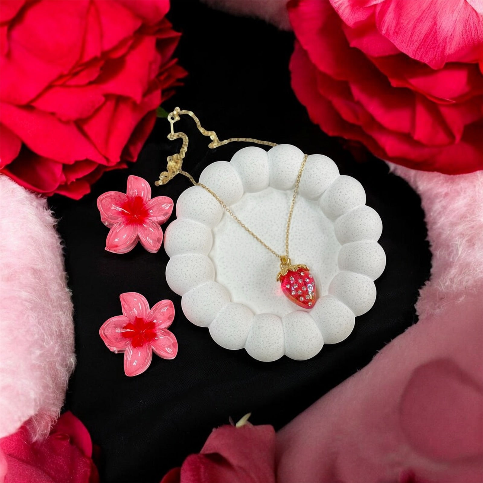 Add a touch of sweetness to your style with our Strawberry Charm Combo, featuring a beautifully crafted strawberry pendant necklace paired with delicate red flower claws.