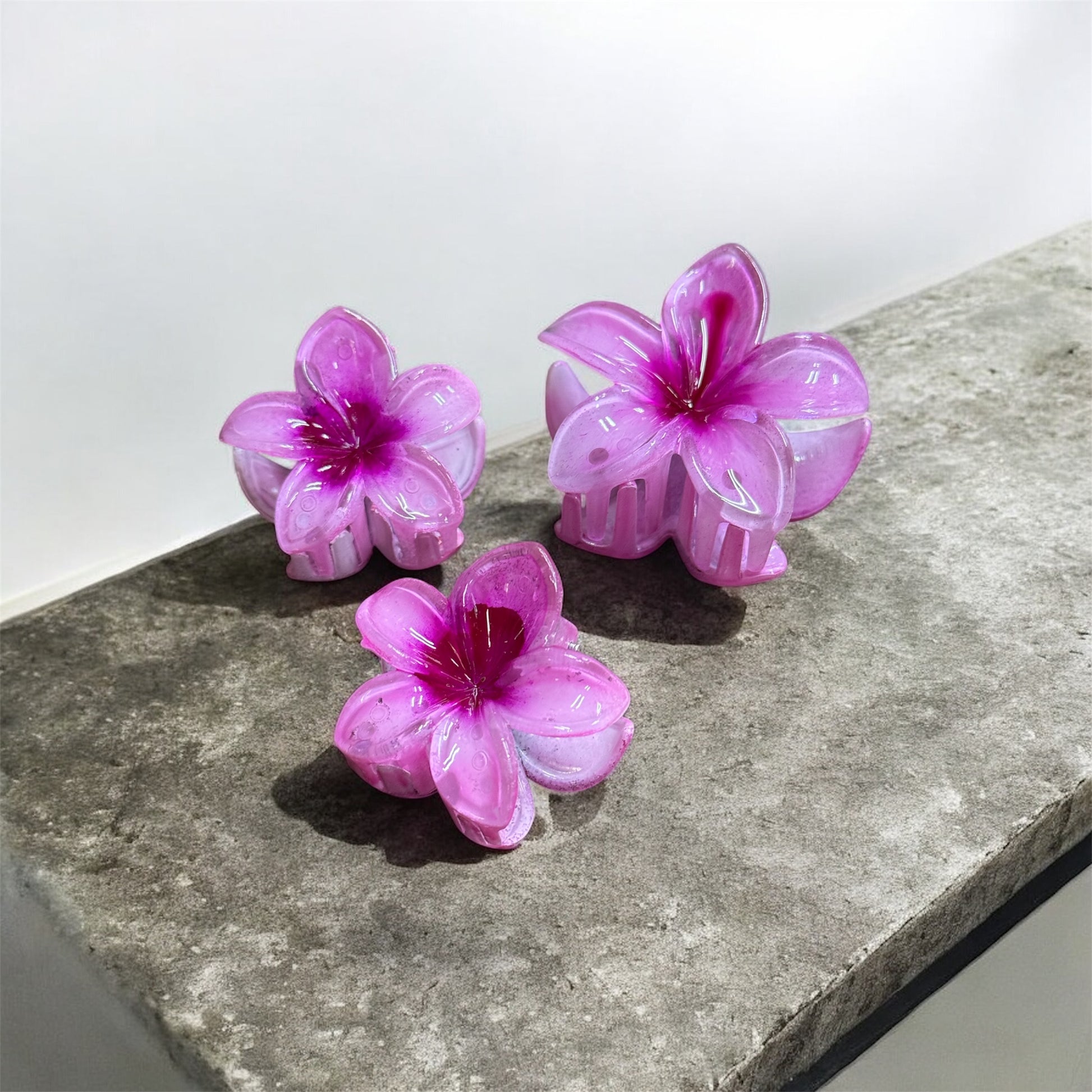 A set of three cheerful, medium-sized hair claw clips crafted in the shape of striking pink and magenta plumeria or cherry blossoms. The translucent resin gives them a glossy, wet look. They are displayed on a rough, grey concrete or stone surface against a clean white background, creating a beautiful contrast between the delicate flowers and the rugged material.